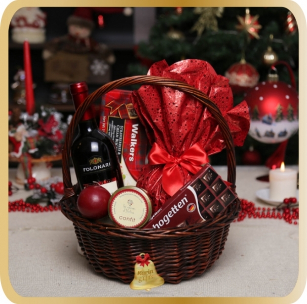 All in Red este un cadou deosebit, ce contine specialitati dulci panettone, fursecuri, confit, ciocolata, toate acompaniate de vin rosu. Cosul cadou este ambalat si decorat manual, in spiritul Craciunului, gata de a fi oferit cu ocazia sarbatorilor de iarna.