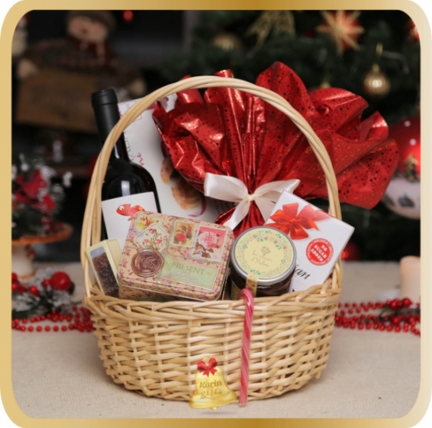 Delicate Christmas este un cadou deosebit, ce contine specialitati dulci precum panettone, ceai, produse de patiserie, pates de fruits, gem, ciocolata, acadea, toate acompaniate de vin rosu. Cosul cadou este ambalat si decorat manual, in spiritul Craciunului, gata de a fi oferit cu ocazia sarbatorilor de iarna.