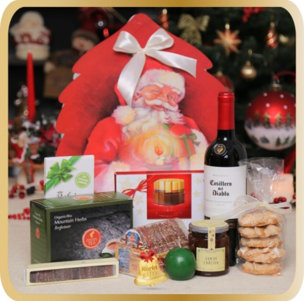 Santa's Gingerbread este un cadou deosebit, ce contine specialitati dulci precum cozonac, ceai, turta dulce, pates de fruits, biscuiti cu migdale, gem, ciocolata, toate acompaniate de vin rosu. Cosul cadou este ambalat si decorat manual, in spiritul Craciunului, gata de a fi oferit cu ocazia sarbatorilor de iarna.