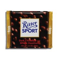 Ritter Sport Dark este facuta din ciocolata neagra cremoasa si alune intregi prajite. Fiecare tableta este umpluta pana la refuz cu alune prajite.