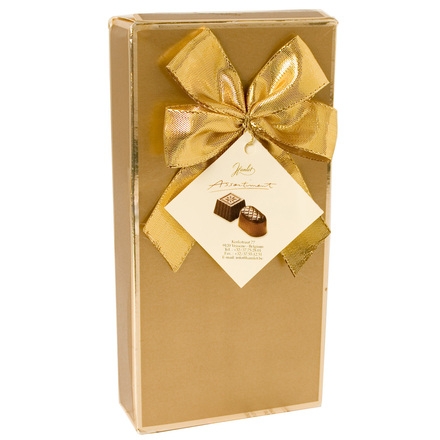 Cutie foarte eleganta cu praline belgiene, decorata cu fundita aurie. Are atasata eticheta cu descrierea sortimentului de praline continut in amestec de ciocolata neagra, alba si cu lapte.